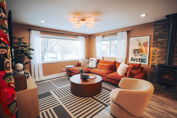 Let the record player spin while you unwind in the designer living room. A plush West Elm sectional, 70" smart TV, and Haida-inspired totem pole set the tone for your stay. Stylish, warm, and undeniably Alaskan.