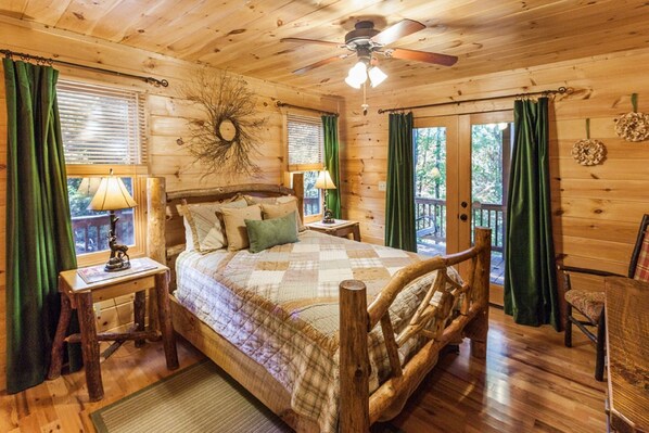 The Queen bedroom on the main level caters to relaxation and access to the large covered porch with seating just adds to the perfection of this cabin. If you're drawing straws for the bedrooms, no worries, you really can't lose. The Queen bedroom on the terrace level lacks for nothing and provides the same level of comfort the other bedrooms offer.