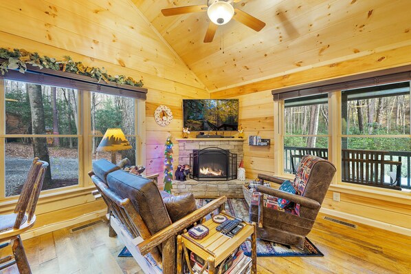 Blue Ridge's peaceful surroundings await at Trail Side Retreat, where natural pine interiors and charming mountain décor meet the comforts of home. Relax in front of a cozy stone fireplace, prepare meals in a fully equipped kitchen, or unwind by the fire pit with sounds of a gentle creek nearby.