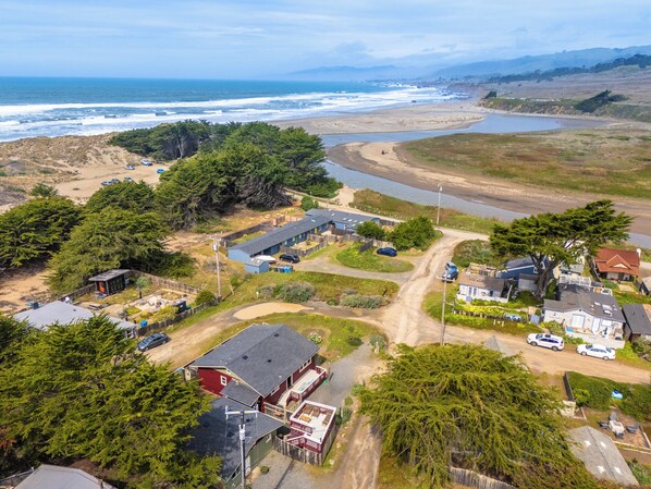 Just a five-minute walk from Salmon Creek Beach, Bodega Breeze is a bright and cheerful retreat designed for relaxation and connection. The main home features a cozy living room with a gas fireplace, a well-equipped kitchen, a dining area, and a master suite with a private courtyard hot tub—perfect for unwinding after a day by the coast.