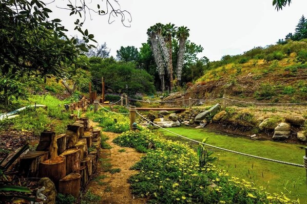 Step into a living storybook—five acres of avocado groves, exotic fruit trees, and a shimmering pond surrounded by gardens that change with the seasons. Wander past flowering herbs, towering trees, and fruit you won’t find anywhere else. Every path leads to something new: a hidden hammock, a quiet bench, or a friendly face (furred or feathered).