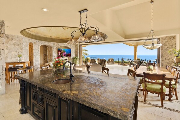 The scenic, open-air domed living room area is the perfect spot to entertain guests while your chef prepares a culinary masterpiece in the professional kitchen equipped with high quality equipment (Sub Zero, Wolf, etc).