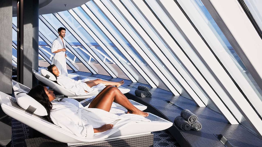 Celebrity Edge offers the most innovative spa features at sea, with a SEA Thermal Suite that comes equipped with a Turkish Bath, a Crystalarium, Salt and Steam rooms, a Rainfall Water Therapy Room, an Infrared Sauna and more. The Advanced MedSpa provides guests with wrinkle treatments, Botox, and filler treatments done by professionals onboard. If you're looking for a fresh new haircut, there's even a salon and barber onboard. There's also a large fitness center with floor-to-ceiling windows, Technogym weight machines, and cardio equipment, as well as a variety of specialty fitness classes available including Ryde, Pulse Barre, and boxing. The Spa Café and Juice Bar nearby is full of delicious healthy options for a post-workout pick-me-up.