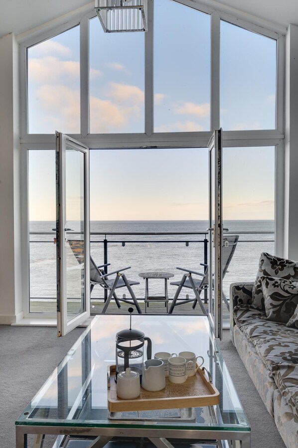 - Large open plan living, dining, kitchen area opening out onto a terrace, with sea views