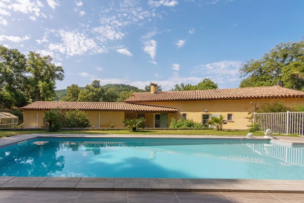 This property features a private outdoor terrace, an outdoor pool, a garden, and a barbecue. Both bedrooms are independent and have lockable access. Two parking spaces are available on the property. One pet is allowed. Smoking and organizing events are not permitted.