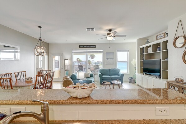 High above the Key Allegro Community, Sand Dollar Unit C3 awaits with serene sunset views over Little Bay from the private balcony. Unwind in this stylish getaway's living area, then whip up fresh meals in the sleek kitchen or head to Rockport Beach and downtown dining options.