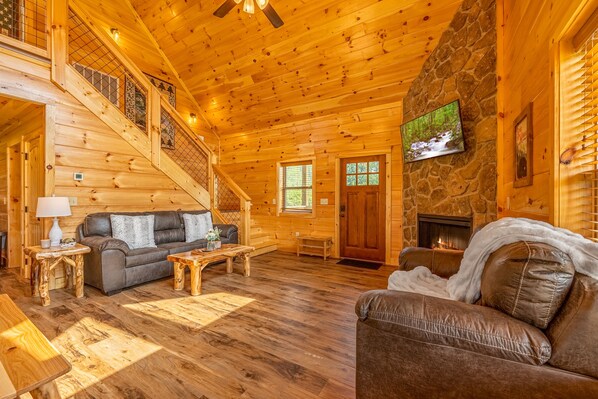 This brand-new 2-bedroom, 2-bath cabin is designed for comfort and fun! With no steep mountain roads to navigate, a flat, paved driveway, and just two small steps to enter, getting here is a breeze!