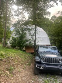 Escape to Slate Crossing, a unique retreat nestled in Wanderlust Woods, just 5 miles from rafting and zip lining. This vintage-inspired geodesic dome offers a secluded stay with mountain views, flowing creek frontage and plenty of space to wander - perfect for those seeking the beauty of the mountains without traditional decor.