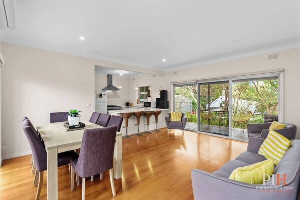 The Space: Accommodation Details: Bedrooms: Three inviting bedrooms including 1 king bed, 1 queen bed, and a bunk bed setup with a double and single, catering to all ages. Living Spaces: A cozy sitting area at the back of the house where you can unwind with your favorite movies and shows. Dining: Gather around the large dining table for heartwarming family dinners or memorable meals with friends.