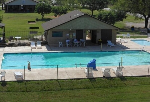 Lakefront campground with a marina and an outdoor pool