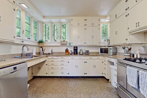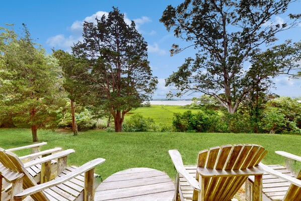 The traditional-style living room is classic New England. In it, find a 27” TV, huge wraparound windows with views of the bay and cozy seating for guests. There's plenty of room for more than one cook in the kitchen, which is decked out with granite counters and everything you need to prepare beach picnics, fancy meals, and midnight snacks. The breezy screened-in porch has another dining area and comfortable furniture. A series of Adirondack chairs in the yard overlooks shining Waquoit Bay.