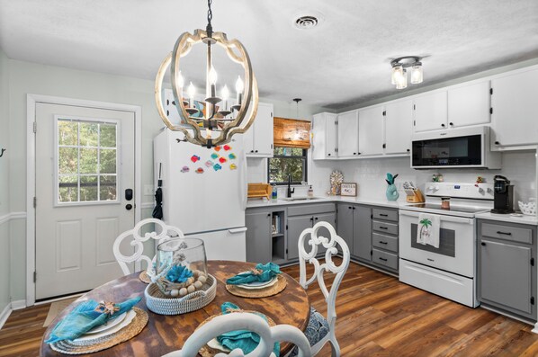 Relax Indoors: Step inside to airy, sunlit spaces where brand-new flooring and large windows create a fresh, inviting atmosphere. The open-concept living and dining area is perfect for gathering after a day in the sun, while the fully stocked kitchen makes mealtime a breeze. With three comfortable bedrooms and two full baths on the main floor, there’s plenty of space for everyone to unwind. Curl up with a good book on a rainy day, or break out one of the many family board games for a cozy night in.