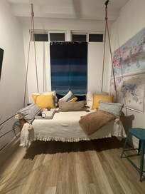 Great ocean views, easy access to the beach, and access to local amenities. You have many restaurants nearby! Absolutely breathtaking views!! I especially enjoyed the swinging daybed on the third floor with a perfect view of the ocean!! Fabulous for watching the sunset!! I enjoyed many nights on the swinging daybed, listening to the surf, waves rolling in and out! I was lucky enough to also be there for a bit of rain, which sounded beautiful and unbelievably relaxing, and it felt like a dream to sleep this way!! You literally come out the front door onto a path with a lovely greenbelt, then descend steps to a landing with benches (another perfect spot for viewing sunsets). Then you can go down the steps to the beach. The home was remodeled perfectly for a beach setting!!