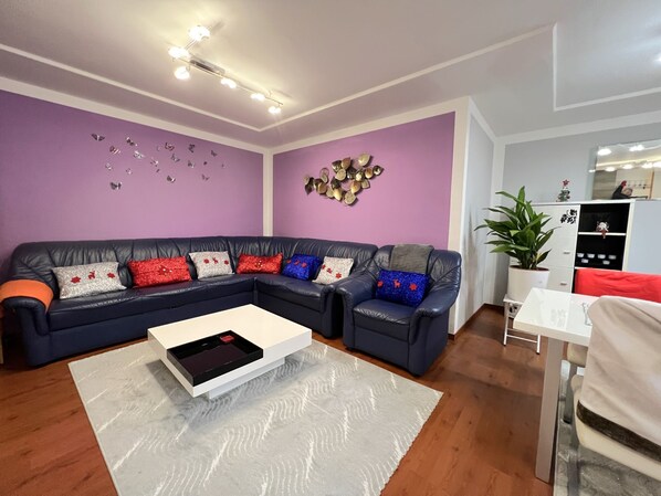 3-room apartment 100 m2, on the lower ground floor. Comfortable and modern furnishings: entrance hall. Large living/dining room with 1 sleeping facility, dining table, international TV channels and flat screen. 1 large double bedroom with 1 double bed and 1 sleeping facility. 1 small double bedroom with 1 double bed and 1 pull-out bed (1 pers. length 180 cm), bath/shower. Open kitchen (4 hot plates, oven, dishwasher, toaster, kettle, microwave, freezer, electric coffee machine). Sep. WC. Heating. Facilities: washing machine, dryer (extra). Internet (WiFi, free). Please note: suitable for families. Non-smokers only. Smoke alarm.