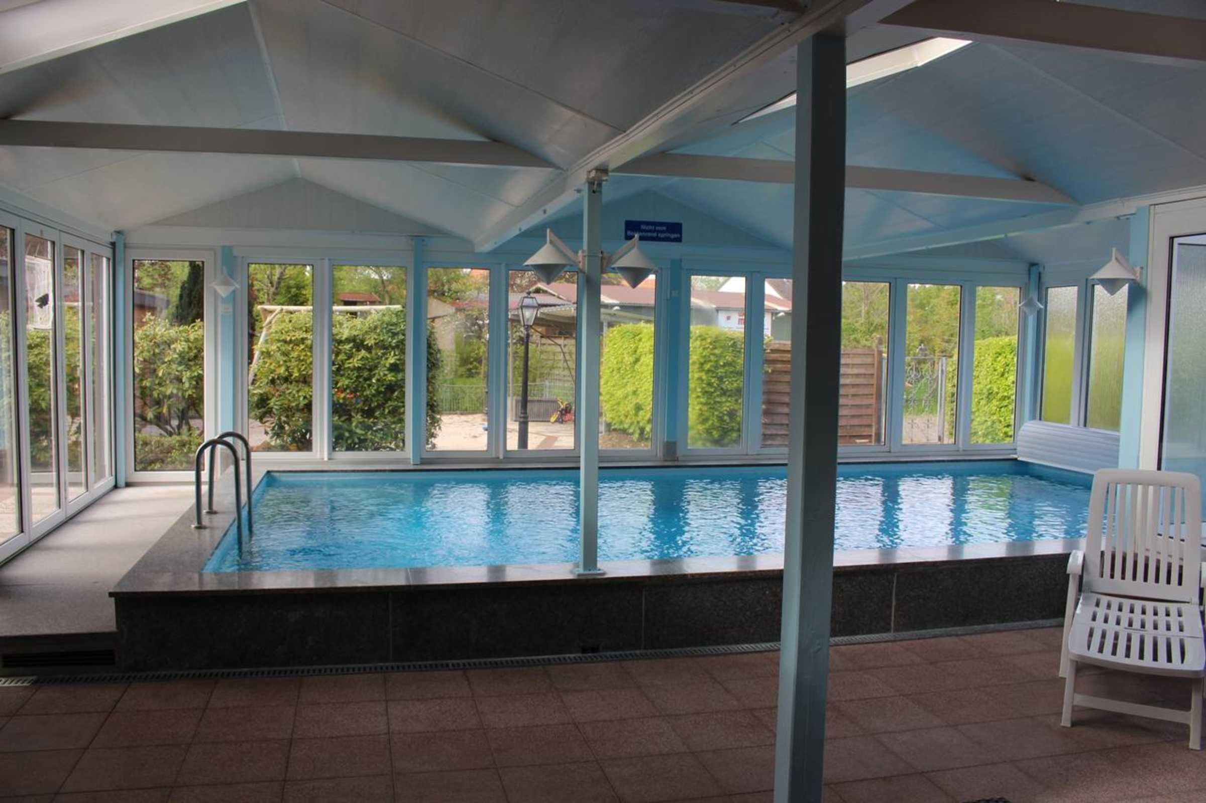 Layout: Ground floor: (Kitchen(hob(4 ring stoves, electric), electric kettle, toaster, oven, microwave, dishwasher, fridge-freezer), Living/bed room(single sofa bed, TV(satellite), dining table, radio, CD player), bathroom(shower, washbasin, toilet)) On the 1st floor: (bedroom(double bed), bedroom(2x single bed)) storage(shared with other guests), Horse riding, Play area, Lawn, cot, washing machine, heating, terrace, terrace, garden furniture, BBQ, parking, trampoline, swimming pool(shared with other guests, heatable, 8 x 4 m.), sand pit, table football, high chair, party games, Swing set, Towels incl., Sheets incl.