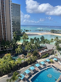 We were excited to be staying at the Ilikai again, since we had been the year before. Communication with the host was great. However, they need to invest some money into this property big time. Everything was outdated. The curtains were stained, uncomfortable bed (sheets, pillows, and mattress), no pictures or anything on the walls, no stools to eat at the kitchen counter, and it was much smaller than anticipated. The toilet was slow to flush and the kitchen sink drained very slow. The AC was a big issue for me. It was over 80 degrees in Waikiki when we went and the host directions said that we couldn't turn the air on lower than 70, to turn it off when we leave the room, and if it breaks then we were responsible for paying for it. They must have been having problems with it since there were metal containers on the patio to catch the water dripping. The host was quick to respond, which was appreciated and they tried to right the wrongs by sending someone in to look at the AC (who said he couldn't do anything) and they offered to send a plumber. We were not happy at all with the stay, especially for the amount that we paid. We cut our stay here short and moved to a different location for the remainder of our trip. Great location and view of the lagoon, beach, and fireworks. I really do appreciate the communication, efforts, and understanding from the host but it needs a serious renovation.