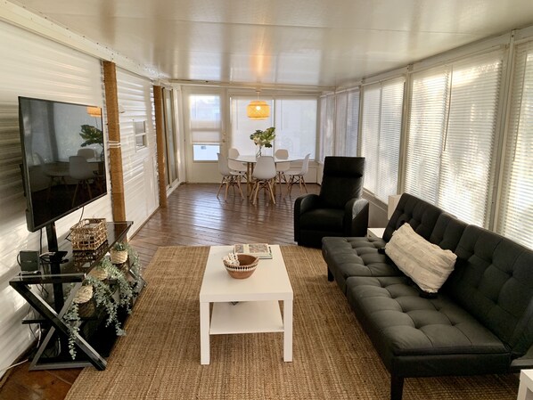 Welcome to your cozy coastal getaway! This charming home features a master bedroom with a queen-sized bed, along with two futon beds—one in the living room and the other in the dining/study area—perfect for accommodating additional guests.