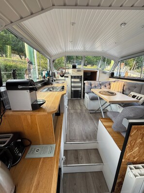 Unser Aufenthalt, war sehr kurz aber ein kleines Highlight, da wir die Zeit auf diesem Boot nutzen durften. Ob drinnen oder draussen, jeder fand ein Plätzchen für sich, um zu spielen, schlafen oder einfach Auszuruhen. Ein richtiges Raumwunder auf dem Wasser. Essen gab' es in unserem Fall immer draussen auf der ("Deckterrasse"). Man hatte dort eine schöne Sicht auf das Wasser, die Umgebung und die vielen Tiere um uns herum.Was die allgemeine Versorgung angeht, war alles zu Fuss erreichbar (Essen Trinken Restaurant Infopunkt Bus und Bahn ...)Erwähnenswert ist die Klimaanlage im Boot, zwei WC's, 3 Waschbecken und eine Dusche (die wirklich gross genug ist auch wenn es erst nicht den Anschein hat). Tatsächlich war der WC -Gang ein bisschen komplex aber umsetzbar und somit kein Problem.Hervorzuheben ist die ausserordentlich gastfreundliche und dennoch rücksichtsvolle Familie, die uns mit Rat und Tat zur Seite stand. Viele lieben Dank dafür. PS. Um sich auf Frankreich einzustimmen, lohnt es sich, zumindest 1x das Frühstücksangebot zu buchen ...wir hatten noch ein paar eigene Leckereien ( siehe Tisch ) aber das Angebot für 4 Personen einen Kaffee von der Kapselmaschine ( auf dem Boot) ist wirklich genug.