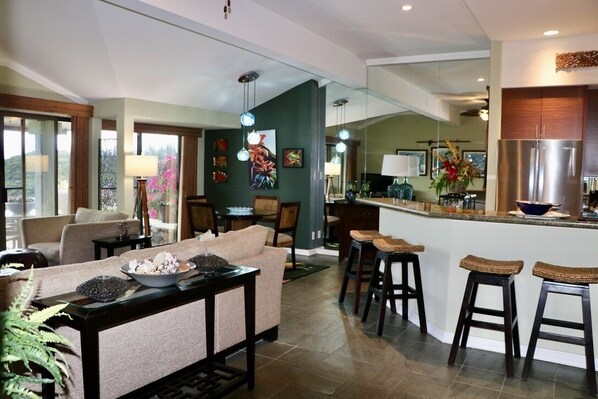This two-bedroom, two-bath villa is located on the Kapalua Bay Course and offers all the comforts of a home. The unit is located down a flight stairs from the parking area and outside on the lanai there are some rolling grass hills. Unit may not be suitable for younger children because of these reasons. Enjoy cooking in this remodeled and fully equipped kitchen as you gaze out at the beautiful sunset. In the living room, you will find comfortable seating and a flat screen TV for relaxing after a fun day outdoors.