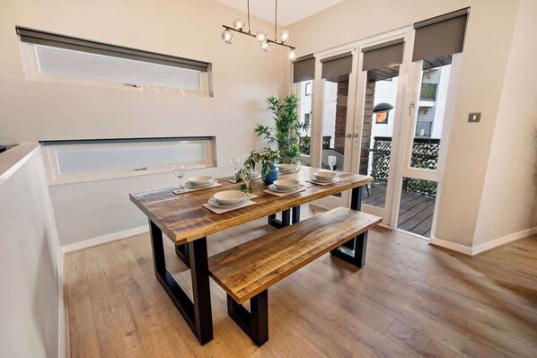 Modern and stylish, the dining area includes a wooden dining table and two matching benches which can sit up to 6 guests.
