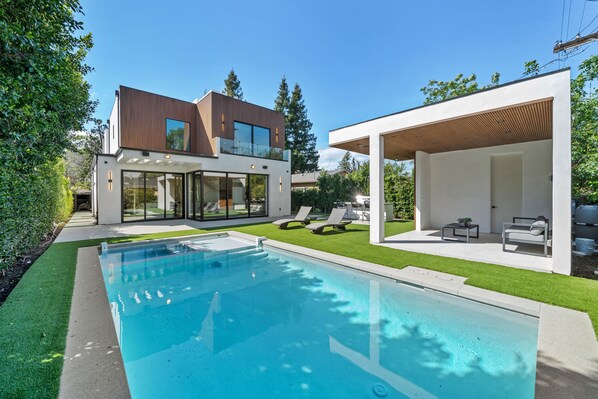 Experience the ultimate retreat in a beautifully designed villa, located in a quiet Sherman Oaks neighborhood. With an expansive yard, outdoor BBQ and kitchen, covered lounging area with full bathroom nearby the pool and spa. Enjoy Fleetwood doors that lead to a state-of-the-art kitchen perfect for gatherings.