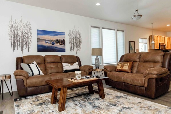 Inside Open-concept living, dining & kitchen Fully equipped kitchen with stainless steel appliances & Keurig Large smart TV in living room and every bedroom with streaming services Electric fireplace for cozy evenings In-unit washer & dryer High-speed WiFi throughout 2-car garage — perfect for gear, skis, bikes & strollers