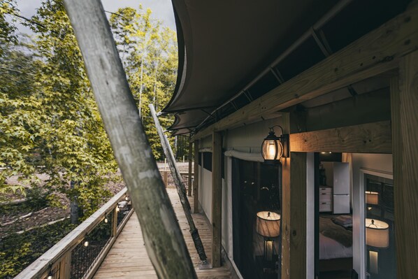 The Perch - Glamping tent with 1 King bed for 2 adults. En suite bathroom, Screened in porch.
