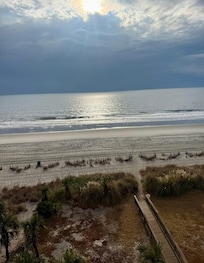 This beauty is located in Ocean Blue Resort, unit 601, located near 27th Avenue on South Ocean Boulevard at the southern end of Myrtle Beach. This cozy retreat is furnished with high-end elegant furniture and artwork from the one and only Charleston artist, Gordon Wheeler! The condo is spacious and comfortable with floor-to-ceiling windows you can view the breathtaking sunrises and have an unobstructed view of the Atlantic Ocean.