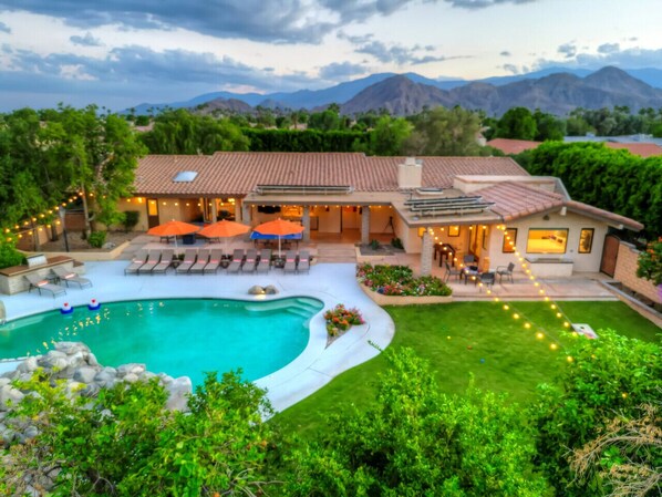 This beatiful estate home is your own private resort with pool, above ground hot tub, built-in BBQ, chipping hole practice area, firepit, corn hole and outdoor games and lots of outdoor seating.
