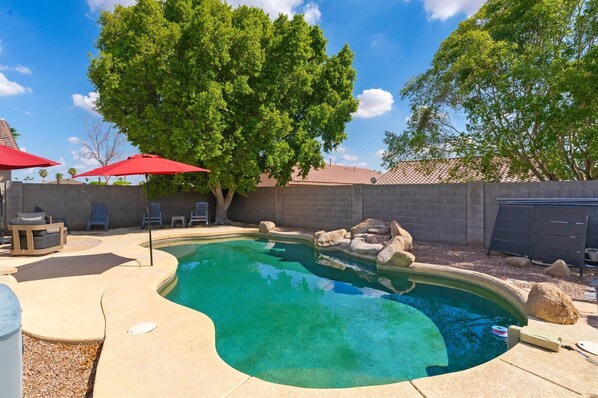 Desert charmer with enclosed yard, heated pool, smart TVs, W/D, & full kitchen