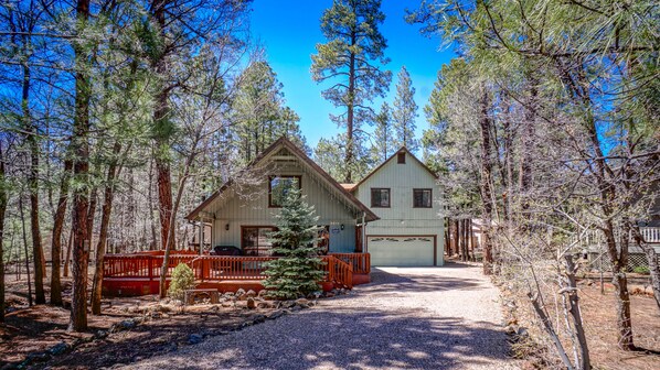 This cozy spacious 'lodge-style,' knotty pine cabin is tucked away in the beautiful Ponderosa Pines on a large wooded lot and features a spacious front private deck for relaxing. The cabin is beautifully decorated with amazing mountain flair! There is 2 separate fenced areas for pets to play. Very private views and in a cul de sac and plenty of room for the dogs to run around and play! The cabin is located in Pine Top Lakes Country Club.