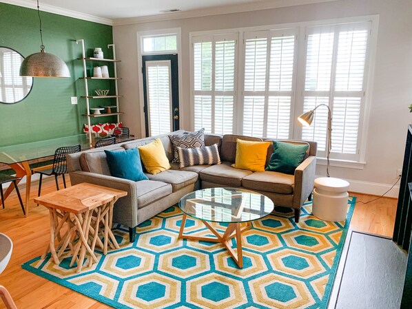 With 10' ceilings and an open concept- you will love how spacious our home feels. The kitchen flows into the stunning living-dining room combination. Warm up by the gas fireplace, watch a movie on the 55" Roku SmartTV and take your breakfast on our floating bench.