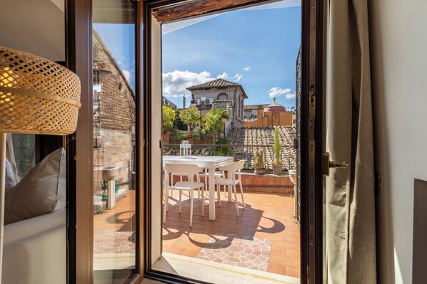 The highlight of the apartment is the terrace, which offers breathtaking views of the ancient rooftops of Rome's historic center. It's the perfect place to relax and enjoy the unique atmosphere of the Eternal City. The terrace features a large table for outdoor dining, ideal for sharing convivial moments with friends or family.