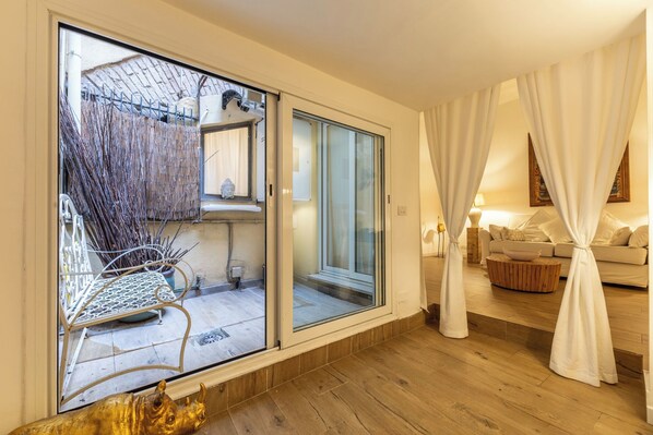 Continuing, you reach a living area with a sofa bed and an ottoman bed. Near this area, there is a bathroom without a shower. From the living area, you access a small terrace for outdoor breakfasts. Further along, you reach a bedroom with a double bed and a full bathroom with bidet and shower.