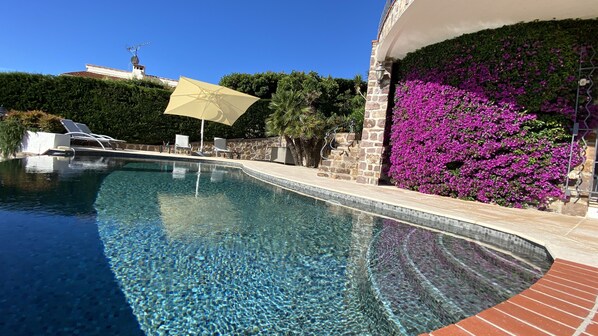 Une vraie vue mer avec un très beau jardin agencé avec des restanques fleuries. La piscine chauffée offre un confort de détente et bien placée près de la maison. Très près du littoral, on peut vite accéder aux sports nautiques et aux nombreux restaurants près de la mer. La maison est agréable avec de grandes pièces et accès faciles entre elles. A recommander !!