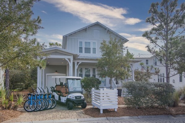 Enjoy our street-legal, 6-seater street legal golf cart AND 6 Bikes, to cruise down 30A in Style!