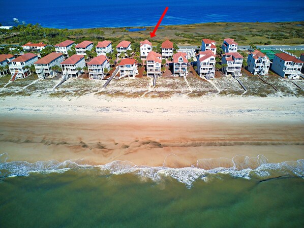 The exterior of Blue Heron @ Sunset offers under-house concrete parking with an elevator and convenient covered entry. Just steps to the community boardwalk to the beach. Enjoy the enclosed outdoor shower (hot/cold), a fish cleaning area for your fresh catch and a park-style grill to prepare it.