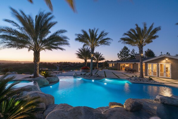 > Private Pool + Spa with scenic backdrop