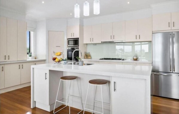 • Modern and Well-Equipped: The kitchen features quality appliances, a Nespresso coffee pod machine, Caesarstone island bench, and plenty of storage. One of the guests said, "The house floor plan was excellent."