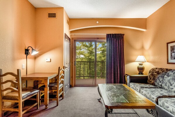 Relish in on-site resort convenience and easy nearby access to downtown Dells at this Chula Vista Resort condo. Perfect for a couple's getaway or small family vacation this hotel studio features a spacious layout complete with a private balcony, smart TV, mini-fridge, and microwave. Home essentials include central air-conditioning and complimentary WiFi.