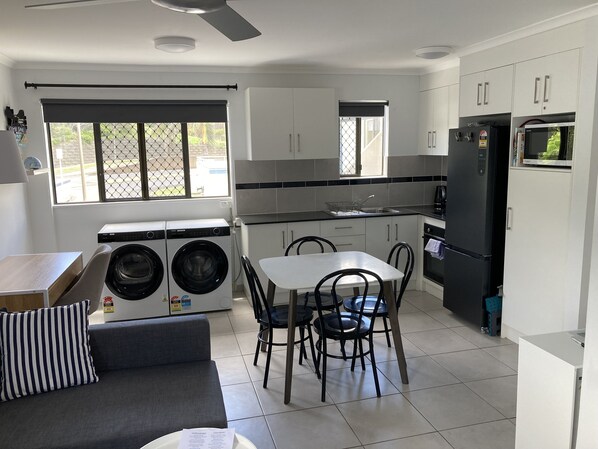 For added convenience, the apartment is equipped with a separate washing machine and dryer, allowing you to keep your beachwear fresh and ready for your next seaside adventure. No need to worry about laundry facilities or laundromats; everything you need is right at your fingertips.