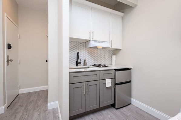 Everything you need and nothing you don`t. Our motto is to provide fairly priced furnished apartments in great locations. The location will make up for the cramped space, but I think you`ll find that once you settle in, you don`t always need a ton of space! This unit is unique because it has a long hallway once you enter the apartment and the space is located in the back of the building so it should be super quiet.