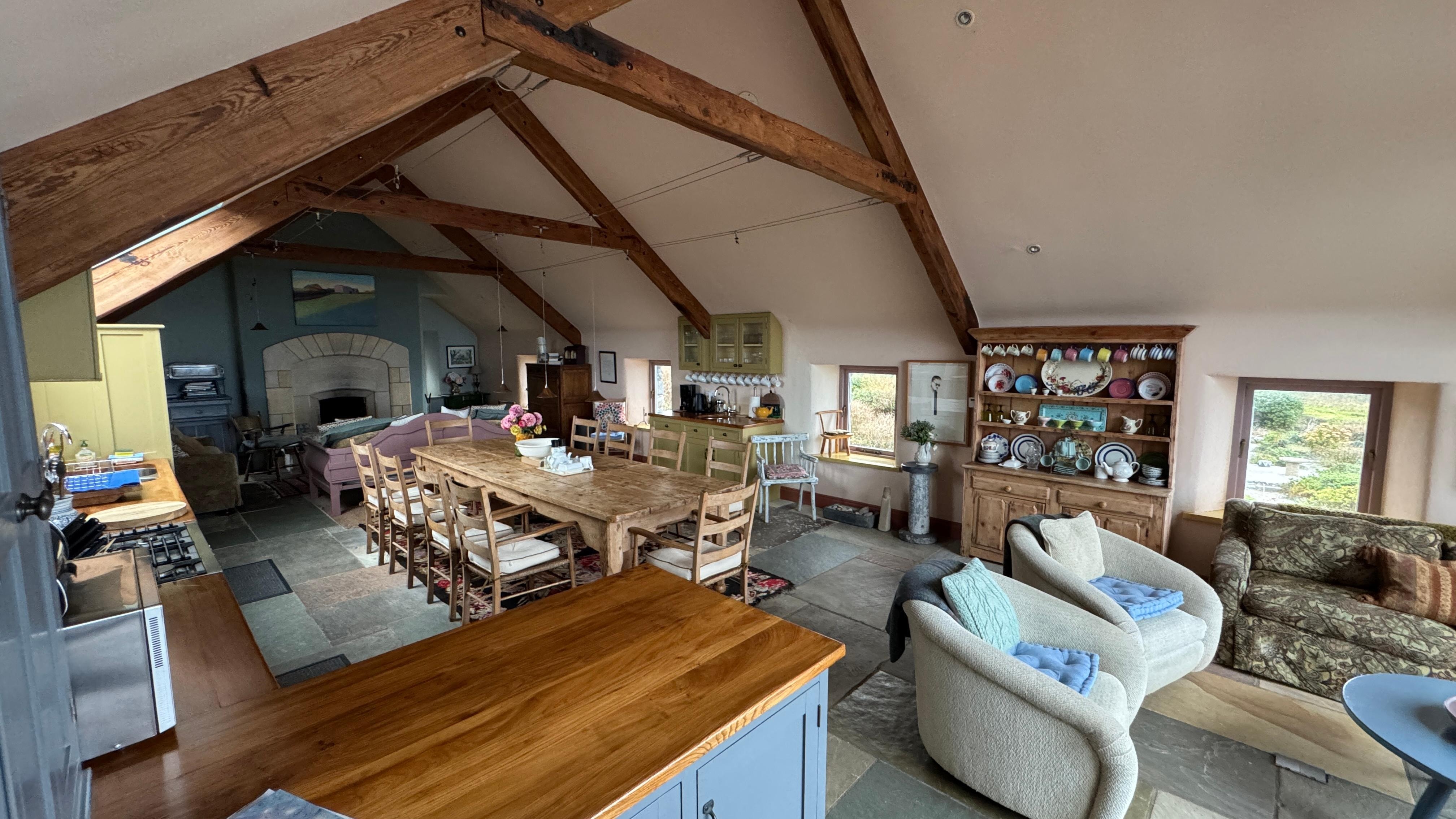 In a picturesque setting, this charming stone barn-style house offers an unforgettable retreat. With its Great Room featuring a magnificent stone fireplace and floor-to-ceiling windows overlooking the Aran Islands and Galway Bay, you can unwind in comfort. The house has two en-suite bedrooms with king and queen-sized beds, plus underfloor heating for cozy warmth.