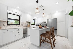 ⋗ Modern appliances and a kitchen island with bar seating for 2.