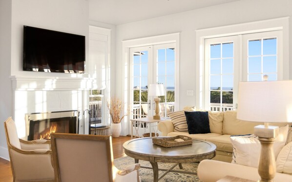 The third floor is where the magic happens—there’s a spacious kitchen and dining area, plus a living area with a fireplace and large windows that show off jaw-dropping views of the Gulf and the park’s white sandy dunes.