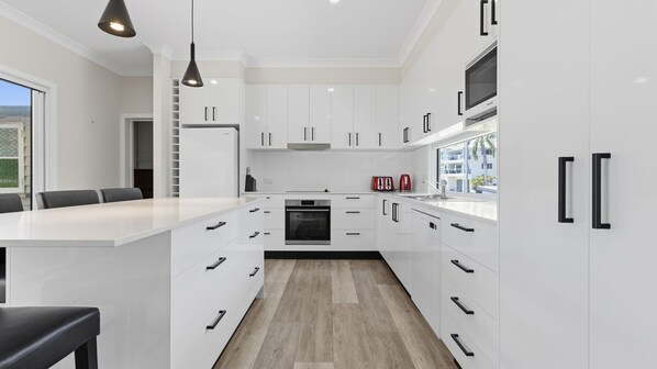 The main open-plan living area features a comfortable lounge room with a Smart TV with Foxtel and Wi-Fi, plus a modern, spacious kitchen complete with a dishwasher and a large island bench with seating.
