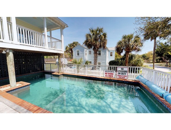This elevated Low Country beach home is surrounded by lush tropical landscaping, and is located one short block to easy beach access and miles of beautiful beach. The tropical landscaping includes fruit bearing banana, orange, lime, and tangelo trees. Enjoy the afternoon sun in the 30' long x 13' wide, elevated, Gunite pool which is accented by extensive IPE decking. Pool is 4' deep in the shallow end and 6' deep at the other end. The first floor of the interior offers an open living and dining area with direct access to a large covered deck and wood floors throughout. Adjacent to the living and dining area is a beautiful open kitchen with granite tops, stainless appliances, and an attached laundry room. On the second floor is a large master bedroom with direct access to a renovated master bath, a private covered balcony patio, and attached room perfect for a nursery area. The second floor bedrooms are carpeted. Great floor plan and layout for dual families with children! Jacuzzi tub in master bath does not work. The home is has wireless internet and YouTube TV via Roku TV's. So feel free to watch YouTube TV or login into any of your favorite streaming channels. Other features include: ceiling fans in every room, and a charcoal grill. Fireplace not available for use. No smoking. No pets.