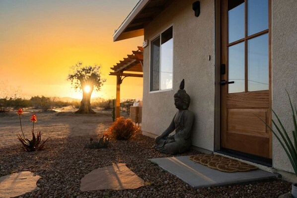 Step into our outdoor oasis, designed for total relaxation and seclusion amidst the stunning high desert landscape. Take in sweeping panoramic views, unwind in peaceful hideaways, and feel completely immersed in nature. Spot desert bunnies hopping by, hear the distant call of coyotes, and take a refreshing dip in our cowboy pool or relax in the hot tub while enjoying breathtaking sunsets and starry skies.