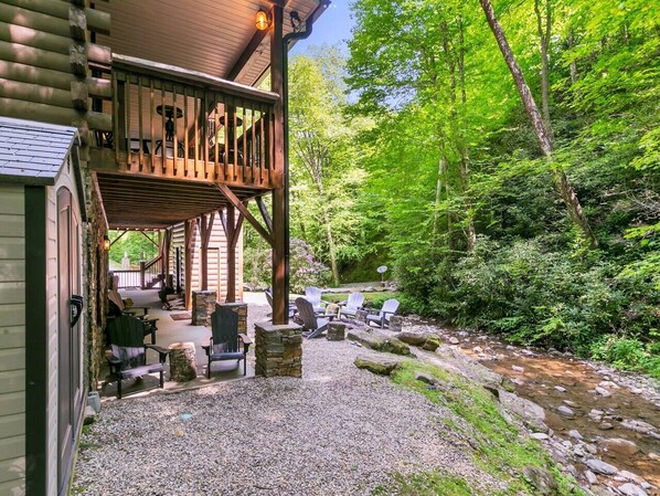 Back outside, our guests can enjoy the fire pit area, along with direct access to the creek to wade in and explore, as well as the stunning waterfall. The cabin is designed so guests can fully experience the beauty of the outdoors and spend time together.