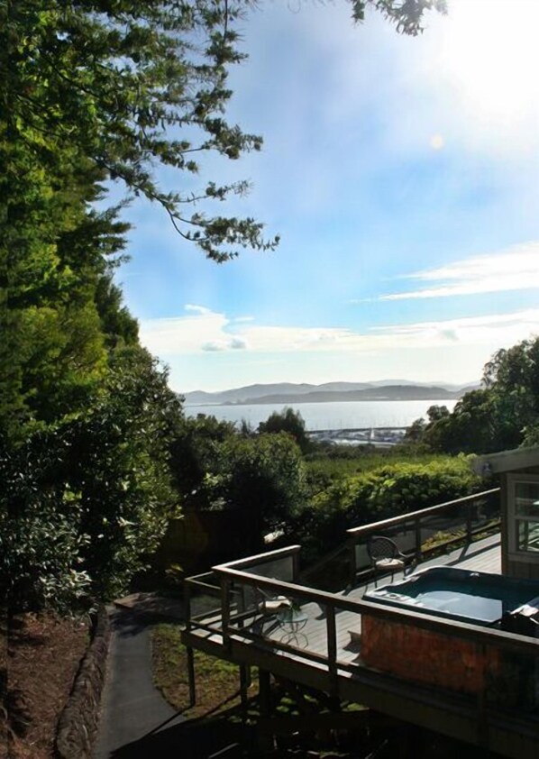 Title: Beautiful, Secluded Bay View Cottage in the Trees Reviews, Deals & Photos 2026 - Expedia [See all properties](http://www.expedia.com/Hotel-Search?regionId=&selected=18763437&adults=2&children=&sort=RECOMMENDED&useRewards=false&semdtl=&userIntent=&vip=false) Entire home # Beautiful, Secluded Bay View Cottage in the Trees Bayside cottage with kitchen and balcony ## Photo gallery for Beautiful, Secluded Bay View Cottage in the Trees ![Exterior detail - Beautiful, Secluded Bay View Cottage in the Trees (San Rafael)](https://images.trvl-media.com/lodging/19000000/18770000/18763500/18763437/7179a418.jpg?impolicy=resizecrop&rw=598&ra=fit) ![Interior - Beautiful, Secluded Bay View Cottage in the Trees (San Rafael)](https://images.trvl-media.com/lodging/19000000/18770000/18763500/18763437/6e577585.jpg?impolicy=resizecrop&rw=297&ra=fit) ![Smart TV, DVD player, books, music library - Beautiful, Secluded Bay View Cottage in the Trees (San Rafael)](https://images.trvl-media.com/lodging/19000000/18770000/18763500/18763437/27d653b2.jpg?impolicy=resizecrop&rw=297&ra=fit) ![Exterior - Beautiful, Secluded Bay View Cottage in the Trees (San Rafael)](https://images.trvl-media.com/lodging/19000000/18770000/18763500/18763437/b05202ff.jpg?impolicy=resizecrop&rw=297&ra=fit) ![1 bedroom, iron/ironing board, travel crib, free WiFi - Beautiful, Secluded Bay View Cottage in the Trees (San Rafael)](https://images.trvl-media.com/lodging/19000000/18770000/18763500/18763437/7dba1ab9.jpg?impolicy=resizecrop&rw=297&ra=fit) - Overview - Location - Amenities - Policies Nestled among oak trees with views of San Francisco Bay, Bay View Cottage offers a serene retreat. With windows in every room, enjoy the sights of deer and squirrels while staying connected with wireless high-speed internet and cable. Relax on the deck or unwind in the hot tub overlooking SF Bay. ## Reviews 10 Exceptional ### Entire home 1 bedroom1 bathroomSleeps 4510 sq ft ## Popular amenities - Kitchen - Free WiFi - Air conditioning - Outdoor Space ## Add dates for prices Check-in Check-out Travelers ## About this property ### Entire place You'll have the entire home to yourself and will only share it with other guests in your party. ### Beautiful, Secluded Bay View Cottage in the Trees This is a beautiful, 20-sided shingled cottage set on more than an acre of oak trees, with views of the San Francisco Bay through the trees. The property is gated with off-street parking. This unique guest house offers one bedroom with a queen bed, and a full size sofa bed in the living room. Windows in every room look out into the oaks, where you can see deer, squirrels, and occasional rabbits. The cottage was built with the finest materials, including slate roof with copper gutters, bamboo and slate floors, granite counter tops, tumbled marble shower, and maple cabinets. A deck with glass railing encircles the entire house. There is a full kitchen with refrigerator, gas cook top, True convection oven, and dishwasher. Wireless high speed Internet and cable are included. The Bay View Cottage is just 2 miles from charming downtown San Rafael, and about the same distance to mountain biking, hiking, and picnicking at China Camp State Park. Don't feel like cooking? The neighborhood grocery store is about a 10 minute walk from the cottage, and their deli offers an extensive selection of salads, sandwiches and pizzas, as well as complete gourmet meals. The wine selection is incredible. PLEASE NOTE: Guests have use of the hot tub, which is on the deck of the main house. You may use it most any time; just give us advance notice. We will close the blinds on that side of the house and you will have a sense of privacy and a view of the SF Bay. ## Property amenities ### Beach - Beach nearby - Beach towels ### Pool/Spa - Hot tub ### Internet - Available in the cottage: Free WiFi ### Parking and transportation - Electric car charging station on site - Car recommended - Parking on site ### Kitchen - Blender - Coffee grinder - Coffee/tea maker - Cookware, dishware, and utensils - Dishwasher - Electric kettle - Ice maker - Microwave - Oven - Paper towels - Refrigerator - Spices - Stovetop - Toaster ### Dining - Dining table ### Bedrooms - Bedroom - Bedsheets provided - Sofa bed ### Bathroom - 1 bathroom - Hair dryer - Shampoo - Shower - Soap - Toilet paper - Towels provided ### Living spaces - Dining table - Living room ### Entertainment - Books - DVD player - Games - Music library - Smart TV with cable/satellite channels - Stereo - Video library ### Outdoor areas - Balcony - Barbecue grill - Outdoor furniture ### Laundry - Laundromat nearby ### Comfort - Air conditioning - Heating ### Pets - No pets allowed ### Suitability/Accessibility - Smoking not allowed ### Services and conveniences - Housekeeping (on request) - Iron/ironing board ### Location highlights - Near an outlet shopping mall - Near the marina - On the bay ### Things to do - Birdwatching nearby - Ecotours nearby - Fishing nearby - Golfing nearby - Hiking/biking trails nearby - Horseback riding nearby - Mountain biking nearby - Sailing nearby - Scuba diving nearby - Surfing/bodyboarding nearby - Swimming nearby - Whale watching nearby - Windsurfing nearby - Winery tours nearby ### Safety features - Carbon monoxide detector (host has indicated there is a carbon monoxide detector on the property) - Smoke detector (host has indicated there is a smoke detector on the property) - First aid kit - Fire extinguisher - Deadbolt lock ### General - Electric car charging station - Housekeeping (on request) - Unit size: 510 square feet ## Similar properties ![Fridge, microwave, oven, stovetop](https://images.trvl-media.com/lodging/27000000/26780000/26770600/26770506/80aa5901.jpg?impolicy=fcrop&w=469&h=201&p=1&q=medium) ### Marin Edwardian Mansion overlooking San Francisco Bay California Park - Kitchen - Washer - Dryer - Pet friendly 9.2 Wonderful 58 reviews $199 nightly $217 total Feb 11 - Feb 12 Total with taxes and fees [](https:/